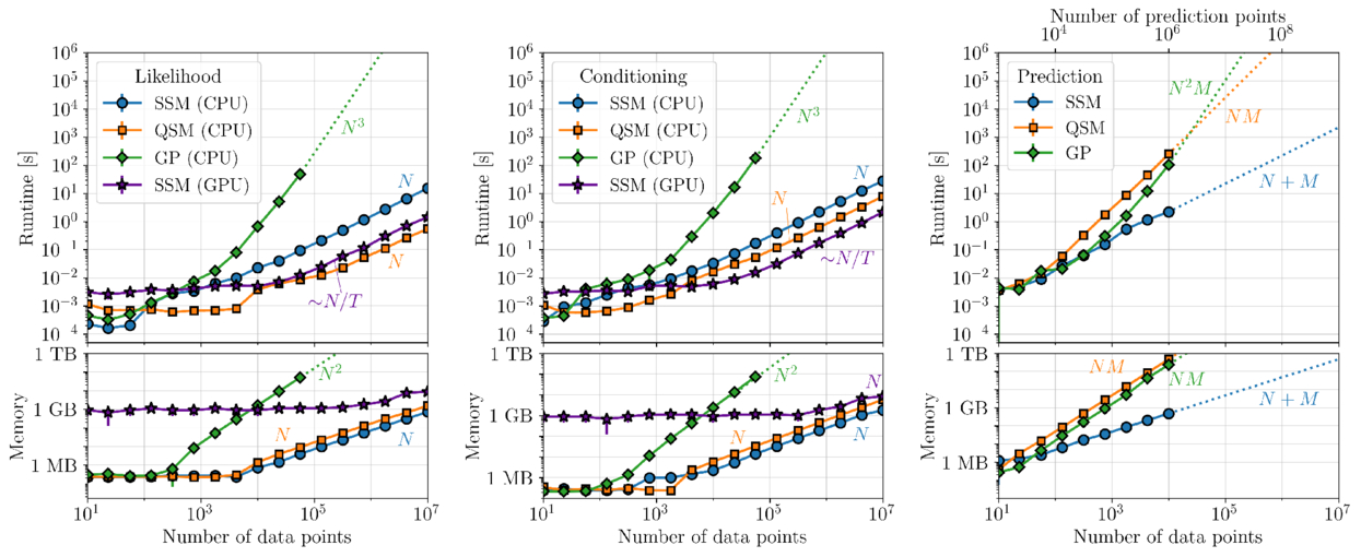 Runtime and memory benchmarking comparing the performance on instantaneous data of the full/dense GP solution (i.e., Equation (4), as in tinygp, green diamonds), using QSM algebra (also via tinygp, orange squares), and our implementation of the sequential SSM solver (smolgp, blue circles); these three cases were all tested on a CPU because their performance on a GPU was degraded. Dashed lines trace the theoretical scaling from the largest value tested. In all cases, the top panel shows the wall-clock timed average of five runs, while the bottom shows the peak memory usage during the function execution. The purple stars show the parallel SSM solver (SG21 as implemented in smolgp) as tested on a NVIDIA RTX 6000 Ada GPU running CUDA v12.8. Left: Results for the log-likelihood as a function of N data points. Middle: Results for conditioning at the N data points, including initialization. Right: Results for conditioning on N data points and then predicting at M = 100N test points, to simulate a typical high-resolution prediction scenario. Takeaway: The SSM shares the linear runtime scaling as QSMs but is typically more memory efficient (especially for predictions). Computing the likelihood is faster in the QSM framework, although for conditioning, the best runtime performance is achieved by the parallel SSM (with high memory overhead on a GPU).