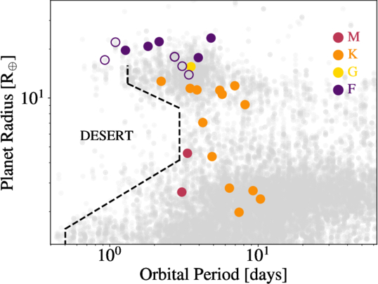 Confirmed transiting planet radii and periods drawn from the NASA Exoplanet Archive on 2025 August 26 (R. L. Akeson et al. 2013; NASA Exoplanet Archive 2024). Closed colored circles represent He* detections of atmospheric escape as a function of spectral type. Open circles denote survey targets. The dashed lines indicate the Neptune desert boundary from A. Castro-González et al. (2024).