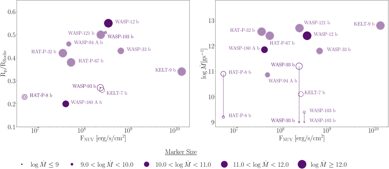 Left panel: Roche filling factor as a function of NUV flux at the planet’s orbit for survey targets and planets orbiting early-type stars with published mass-loss measurements. Right panel: retrieved mass-loss rates as a function of NUV flux at the planet’s orbit. See the Figure 5 caption for additional details.