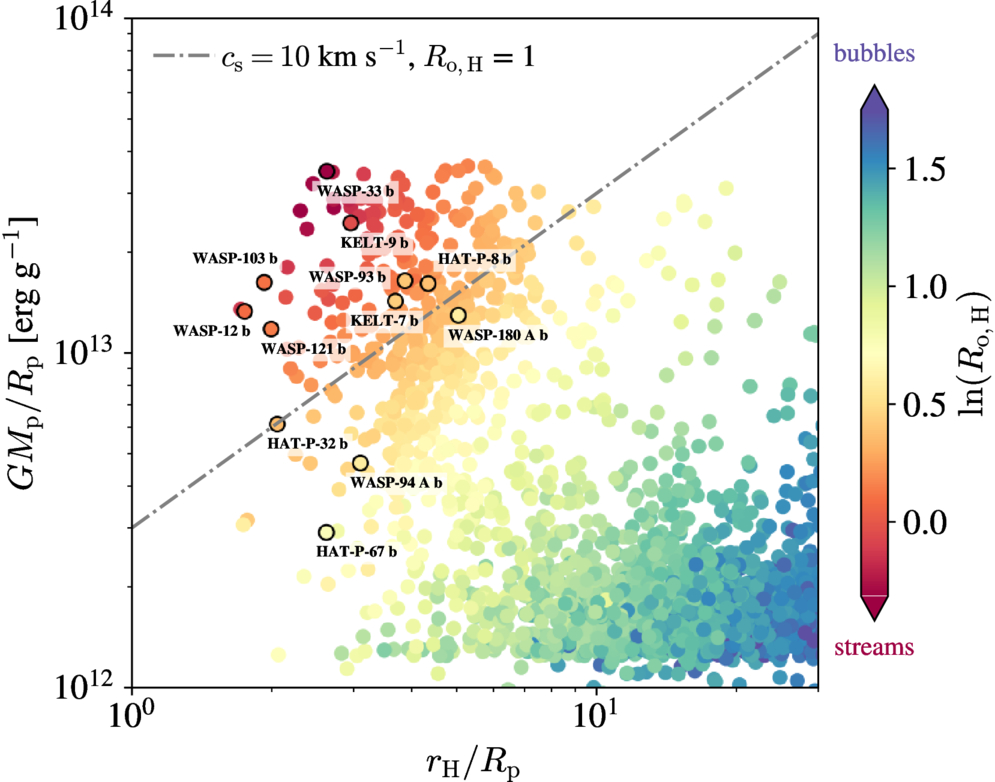 Figure adapted from M. MacLeod et al. (2025) and compiled using PWMorphology. Colored circles represent confirmed exoplanets with radii >1.6 R⊕ from the sunset catalog shown as a function of gravitational potential and the ratio of the Hill to planet radius. Survey targets as well as HAT-P-32 b, HAT-P-67 b, KELT-9 b, WASP-33 b, WASP-94 A b, and WASP-121 b are indicated with circles outlined in black and labeled appropriately. The different colors represent the predicted hill sphere Rossby number ﹩\mathrm{ln}({R}_{o,H})﹩, where ﹩\mathrm{ln}({R}_{o,H})\gt 0﹩ indicates a bubble-like outflow geometry, and ﹩\mathrm{ln}({R}_{o,H})\lt 0﹩ indicates a stream or tail-like outflow geometry. We note that values of ﹩\mathrm{ln}({R}_{o,H})﹩ for HAT-P-32 b, HAT-P-67 b, KELT-9 b, WASP-33 b, WASP-94 A b, and WASP-121 b are calculated using the sunset photoevaporative outflow models for these planets. The dashed gray line indicates photoevaporative outflows with sound speeds of 10 km s−1 and Ro,H = 1.