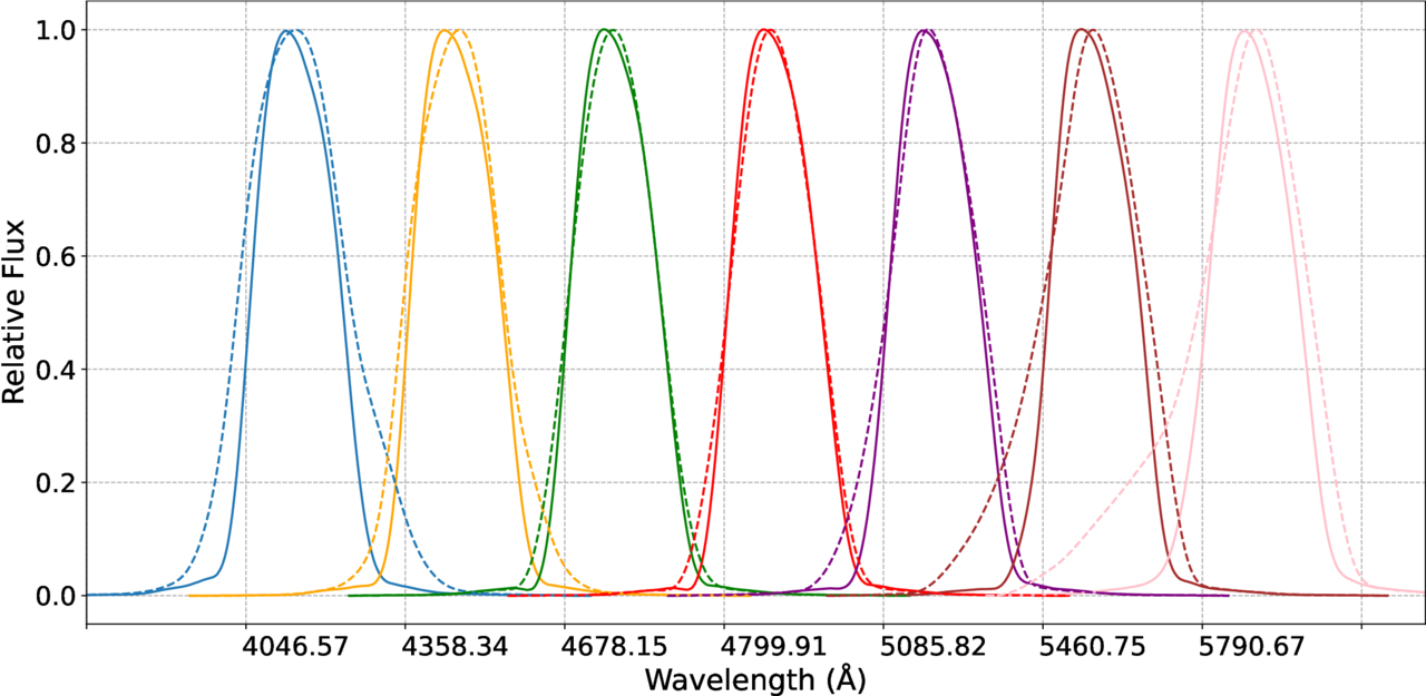 The predicted IPs on two dates. From left to right, the IPs correspond to central wavelengths of 4046.57, 4358.34, 4678.15, 4799.91, 5085.82, 5460.75, and 5790.67 Å. Solid lines indicate profiles from an exposure on the left side of the red dashed line in Figure 9, while dashed lines correspond to ones on the right side.
