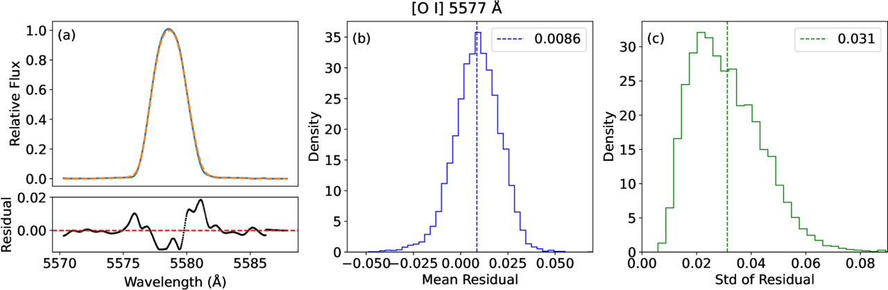 Panel (a) shows one example of the recovered [O I] 5577 Å line profile using our IP model. Panels (b) and (c) show the distributions of ﹩{{\rm{mean}}}_{{\rm{res}}}﹩ and ﹩{\sigma }_{{\rm{res}}}﹩ for all [O I] lines from the year of 2024, respectively. The dashed lines denote the mean value.