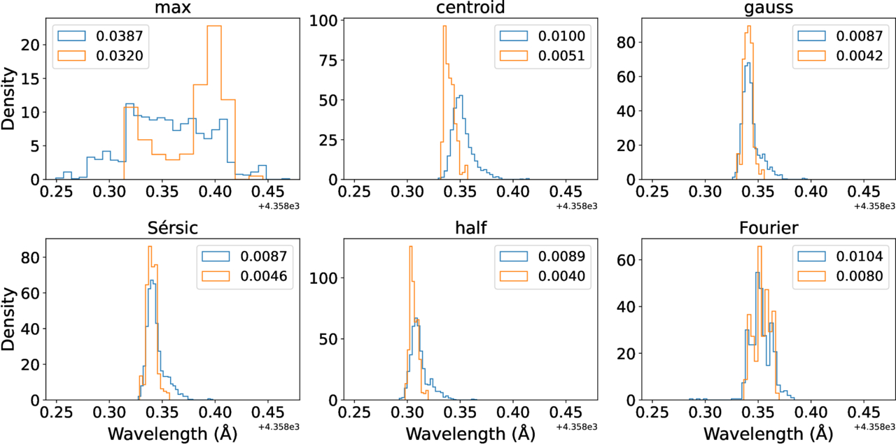 Distributions of the centers of both the original (blue) and neural network predicted (orange) line profiles determined by the above six definitions, as indicated by the titles of each panel. The profiles used here are the emission lines with the central wavelength of 4358.34 Å imaged by the first fiber of Spectrograph No. 1 in 2017. The numerical values in the figure represent the standard deviations of the distributions.