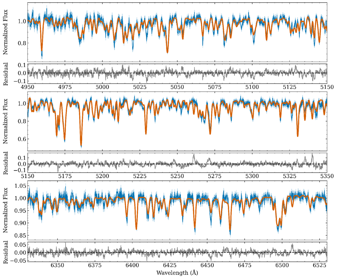 Spectral fits for J0341 in our sample. The observed LAMOST-MRS spectra (blue) are shown with best-fit model spectra (orange) over the wavelength range 4950–6530 Å.
