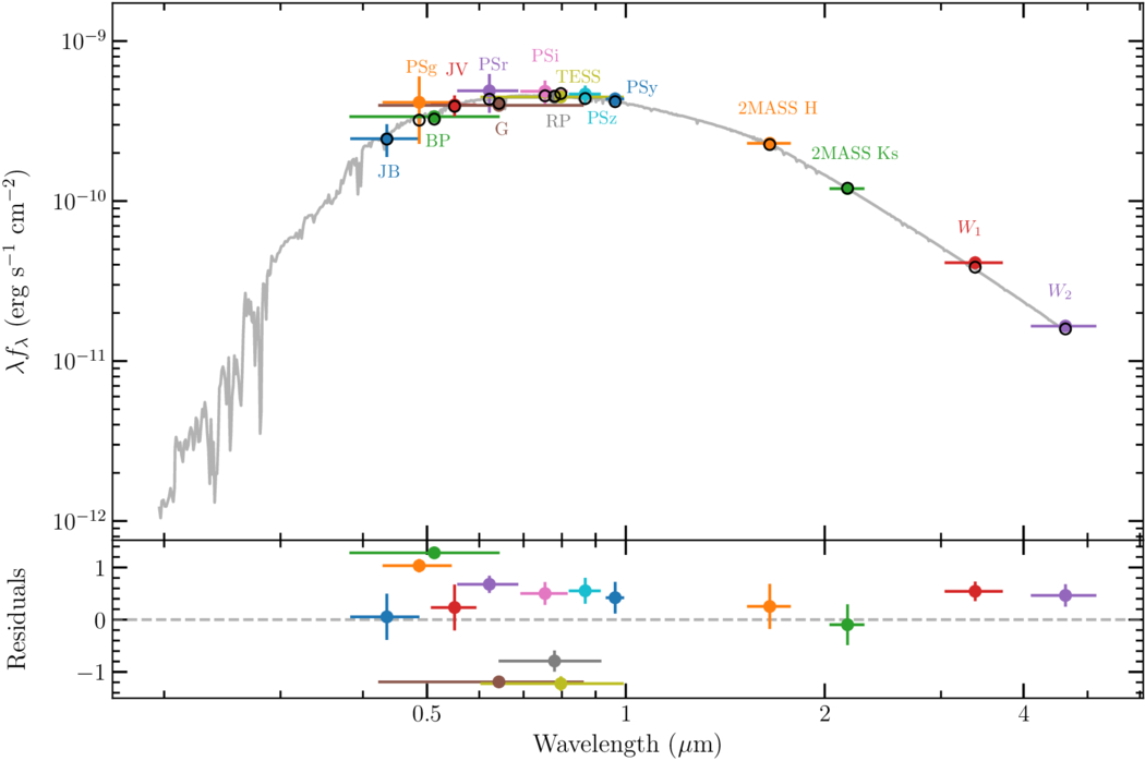 SED fitting result for J0341. Top panel: colored circles with error bars indicate observed photometric measurements, while the gray curve represents the best-fit model spectrum derived from the SED fitting. Filter labels are placed adjacent to their corresponding data points. Bottom panel: the residuals of the fit, normalized by the photometric uncertainties.