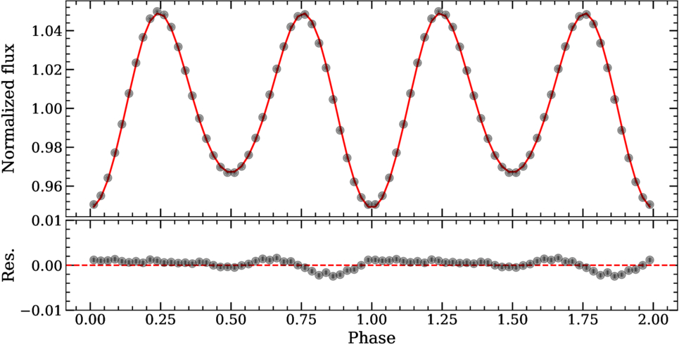 PHOEBE’s best-fitting results. In the top panel, the black dots show the rebinned TESS light curve, and the red curve is the best-fitting model. The residuals between the observed data and the model are shown in the bottom panel.