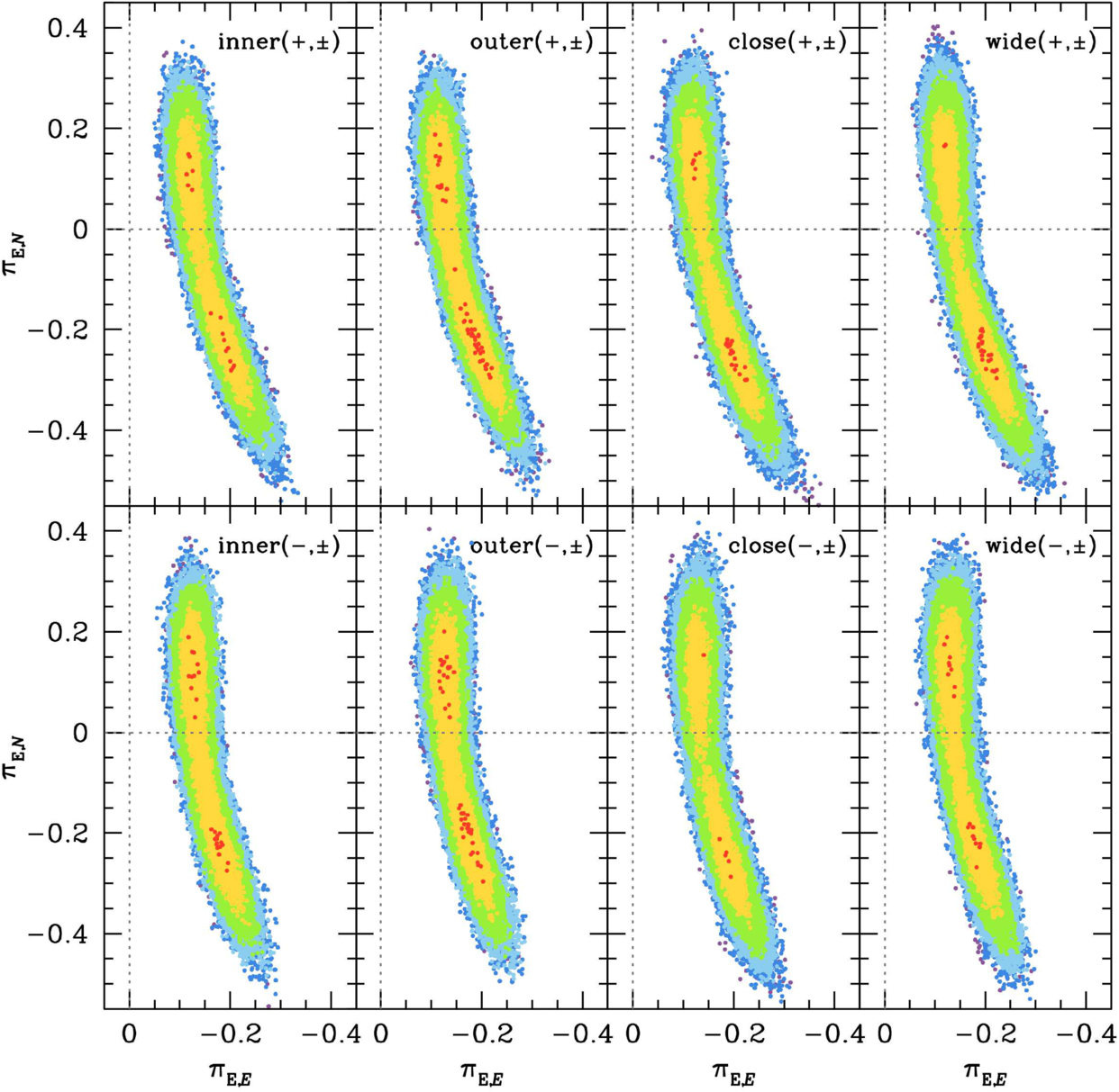 Parallax contours for the eight pairs of solutions of KMT-2023-BLG-1746. Colors indicate values of Δχ2 < 1, 4, 9, 16, 25, 36.