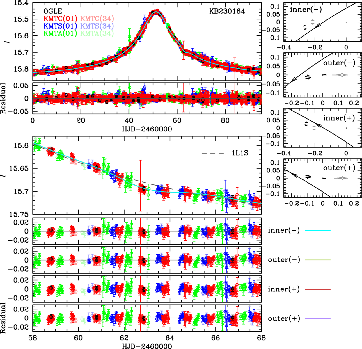 Light curve and models for KMT-2023-BLG-0164. For the four caustic geometry insets at the right, the light-colored caustics represent the configurations at t = t0, while the dark-colored caustics represent t = tanom.