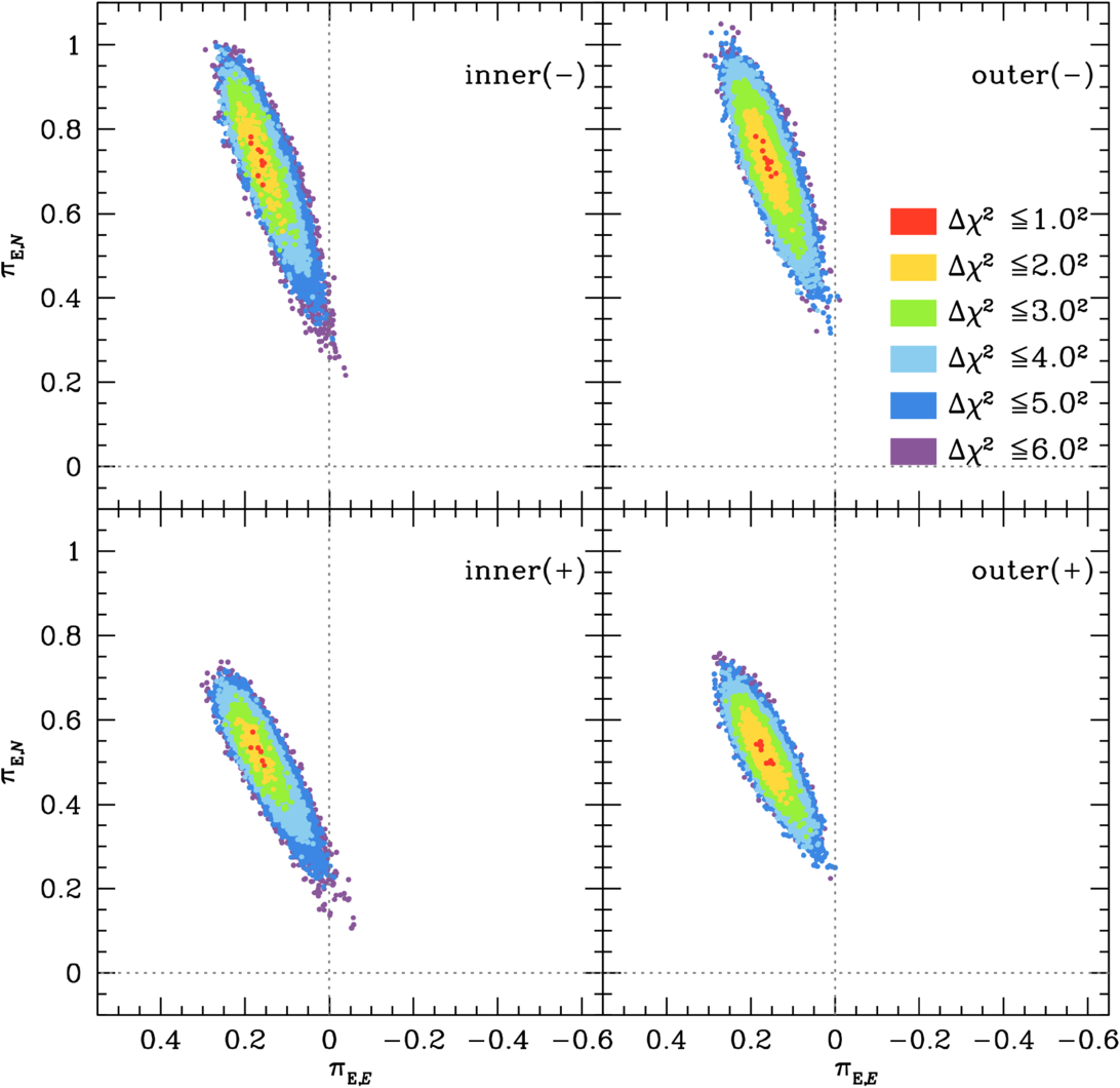 Parallax contours for the four solutions of KMT-2023-BLG-0164. Colors indicate values of Δχ2 < 1, 4, 9, 16, 25, 36.