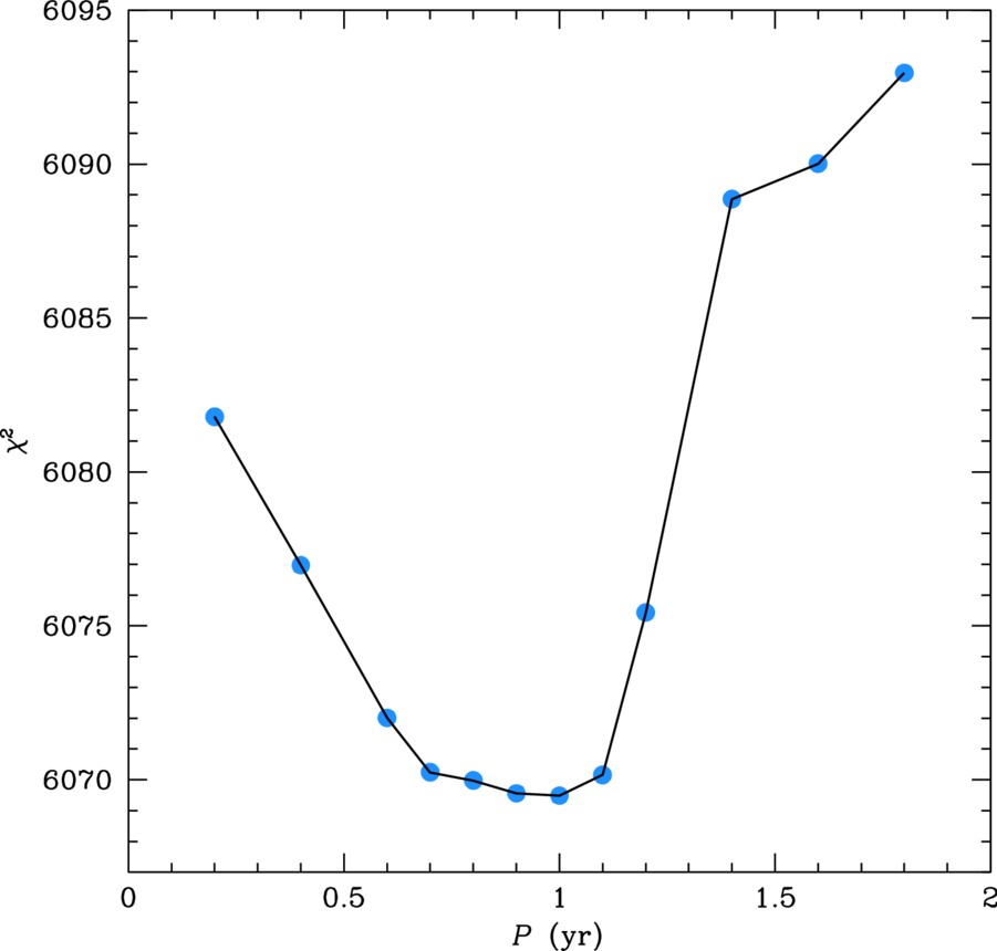 Evolution of χ2 with assumed period P for xallarap models of KMT-2023-BLG-0164 that allow for free fits to the orientation parameters (α, δ). The xallarap period P = 1 yr is the best fit, as one would expect if the actual origin of the light-curve distortion is the parallax effect induced by Earth’s annual orbital motion.
