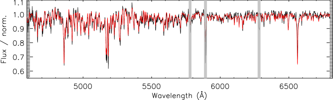 The spectrum of KMT-2023-BLG-0164 with the best-matched template. The black line shows the observed spectrum of the target obtained with IMACS, while the red line represents one of the best-matched MILES template spectrum (HD186427; Teff = 5762 K, ﹩\mathrm{log}\,g=4.43﹩, and [Fe/H] = 0.07), convolved to a resolution of R = 1000. All spectra are continuum normalized. The three shaded regions indicate the masked wavelength ranges affected by interstellar absorption features, including the Na I D doublet and the DIBs at 5780 and 6283 Å.