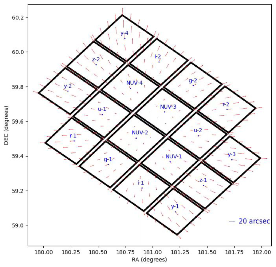 The distortion map of the MSC’s 18 photometric detectors, derived from a subset of the CSST 25 deg2 simulation program. Detector name and number are shown in blue on the central region of each detector box. The size of the distortion vector marked in red is magnified by a factor of 10.