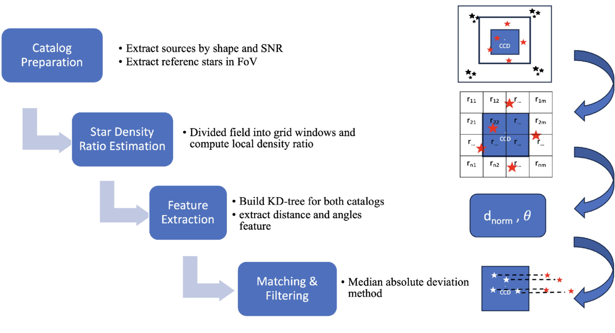 Workflow of the DiGStar algorithm for cross matching. The process involves (1) data clipping and source extraction, (2) grid-based local star density ratio analysis of the image, (3) KD-tree construction for efficient neighbor searches and relative-position feature extraction, and (4) two-stage matching with outlier rejection (MAD filtering). Finally merging matched pairs with source metadata.