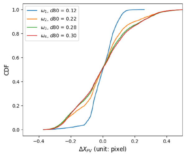 Cumulative distribution functions of the positional residuals obtained from the four weighting functions in different colors. The accuracy d80 denotes the width of ΔX between the 20% and 80% CDF level. The w1(rd) scheme shows significantly better performance than the other weighting functions.