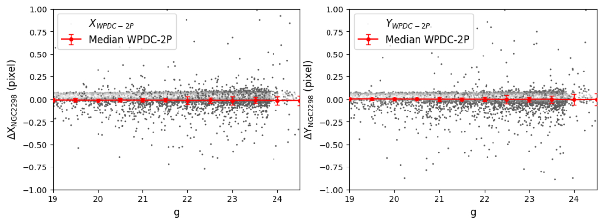 Distribution of GD-corrected positional residuals (ΔXNGC 2298, ΔYNGC 2298) as a function of g-band magnitude. The grayscale shading represents the local density of points, with darker shades indicating higher densities. The red solid lines with error bars show the mean positional offsets and the corresponding 1σ dispersions, computed within 0.5 mag bins.