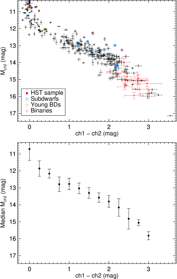 Top: color–magnitude diagram for our sample compared to known nearby L, T, and Y dwarfs from the 20 pc census of J. D. Kirkpatrick et al. (2021). Our targets occupy the bottom of the main sequence, and further highlight the large photometric scatter among the coldest brown dwarfs. Bottom: median absolute Spitzer ch2 magnitude as a function of ch1–ch2 color, in bins of 0.25 mag. The error bars represent the 1σ scatter in the same bins.