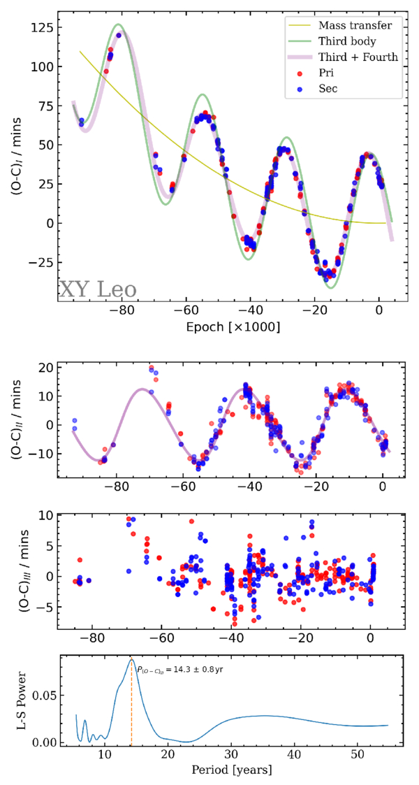 Period change analysis of the XY Leo A system. The panels display successive stages of the O − C analysis. The top panel shows the O − C diagram fitted with two LITE terms and a long-term modulation. The first LITE signal (P ≈ 20 yr) is attributed to the well-established third body, XY Leo B. The second LITE term (second panel, P ≈ 23 yr) is included for completeness; however, magnetic activity is considered a more plausible explanation than an additional stellar component. The third panel presents the final residuals, (O − C)III, which exhibit a coherent quasi-cyclic modulation. The bottom panel shows the Lomb–Scargle periodogram of the (O − C)III residuals, revealing a dominant cycle at ﹩{P}_{{(O-C)}_{{\rm{III}}}}=14.2\pm 0.8﹩ yr, consistent with a magnetic activity cycle of Applegate type.