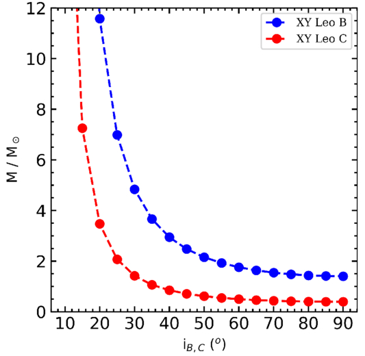 Total mass estimates as a function of orbital inclination for the two LITE components. The first corresponds to the confirmed third body (XY Leo B), while the second signal (LITE2) is treated as speculative and may instead arise from magnetic activity. The curves assume Keplerian motion and are shown for illustrative purposes only; the reality of the second modulation remains uncertain due to potential dynamical instability.