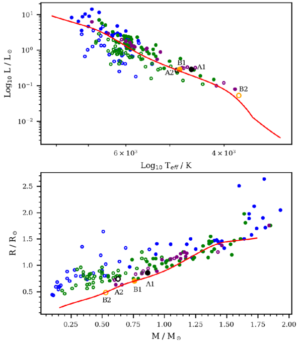 H-R and mass–radius diagrams of the four confirmed component stars A1 (black filled circle), A2 (black circle), B1 (orange filled circle), and B2 (orange circle) of the XY Leo multiple system. Observed quantities for other well-studied W-type (blue), A-type (green) contact binaries, and detached systems (purple) are also shown for comparison, along with the zero-age main sequence (red lines; O. R. Pols et al. 1995; K. Yakut & P. P. Eggleton 2005). Filled circles indicate primary components; open circles indicate secondary components.