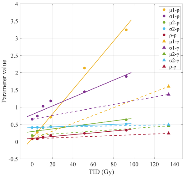 Dependence of probability density function parameters on total dose. ρ − p and ρ − γ are dimensionless, while the other parameters are in e−.