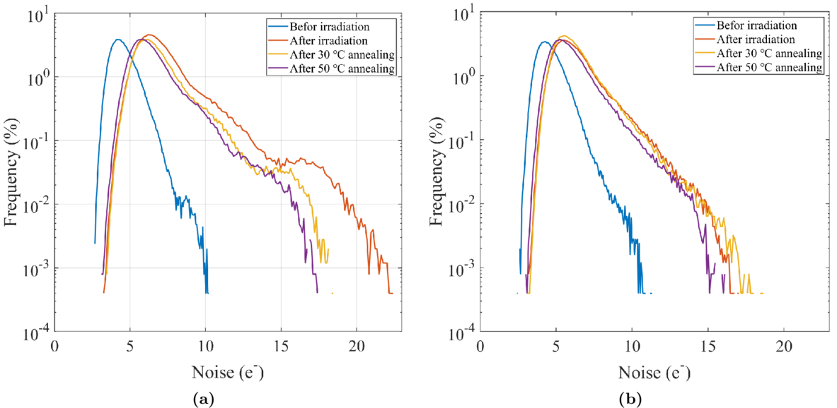Pixel TN distribution across stages. The y-axis is the number of points in the current bin divided by the total number of points. (a) Columns corresponding to proton-irradiated regions with a dose of 3.73 × 1010 p cm−2. (b) Columns corresponding to proton-irradiated regions with a dose of 1.32 × 1010 p cm−2.