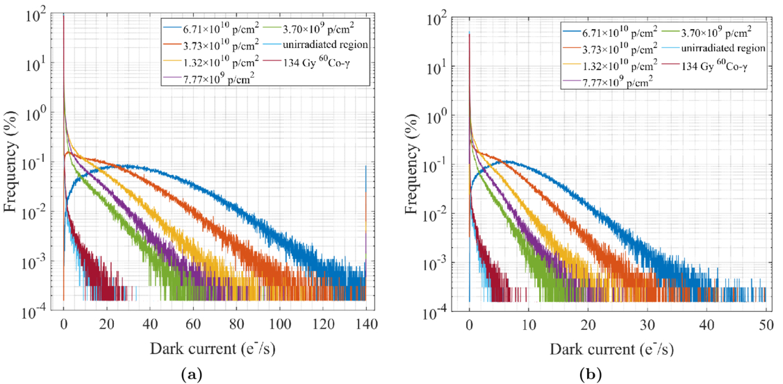 Dark current distribution in different irradiation regions. (a) After irradiation. (b) After 50°C annealing.