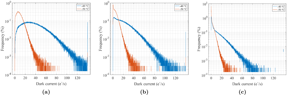 Dark current distribution at different operating temperatures of the sCMOS detector. (a) Proton irradiation region with a dose of 6.71 × 1010 p cm−2. (b) Proton irradiation region with a dose of 3.73 × 1010 p cm−2. (c) Proton irradiation region with a dose of 1.32 × 1010 p cm−2.