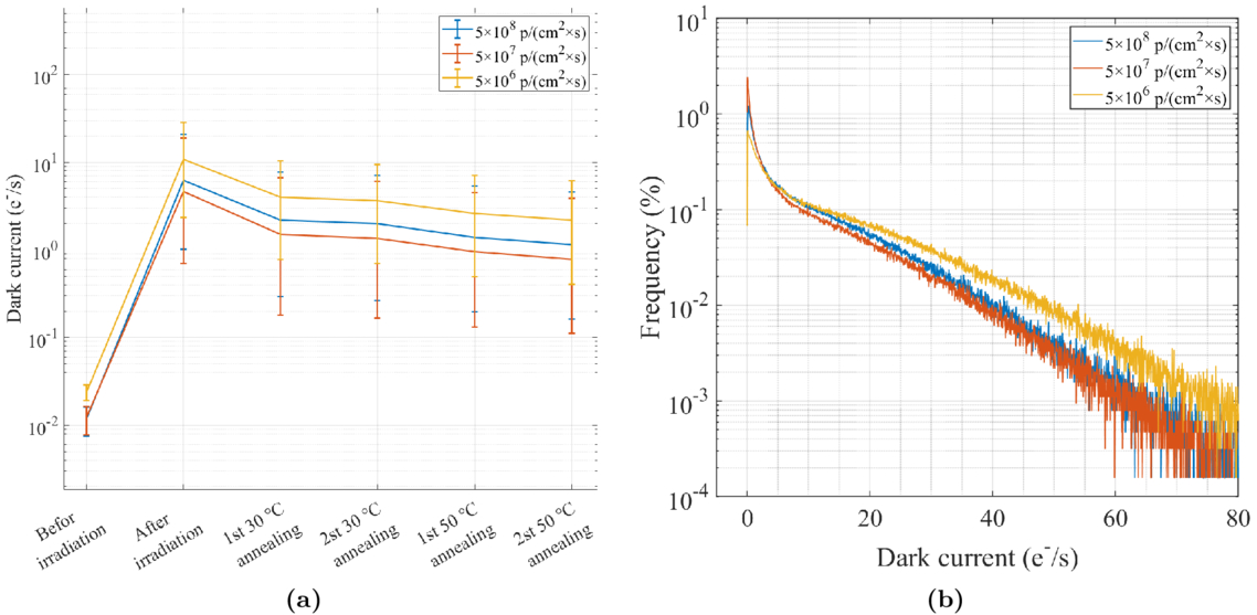 Dark current behavior under different proton irradiation dose rates. (a) Evolution of dark current across stages. (b) Dark current distribution.