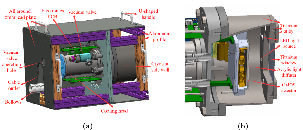 Camera structure model. (a) Model of the overall camera structure and its irradiation shielding design. (b) Model of the internal structure of the cryostat with the titanium window version.