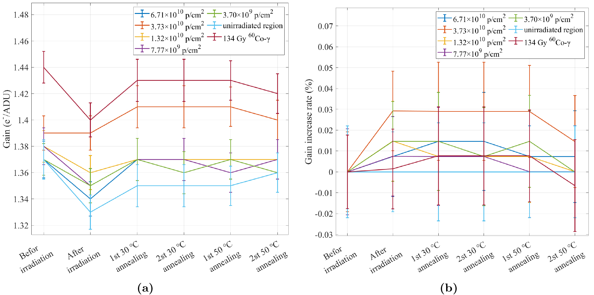 Gain variation with irradiation and annealing in each irradiated region at −40°C. (a) Raw measured values. (b) Corrected gain increase rates, where the gain increase rate of each irradiated region is subtracted by the corresponding rate from the nonirradiated region at the same stage.