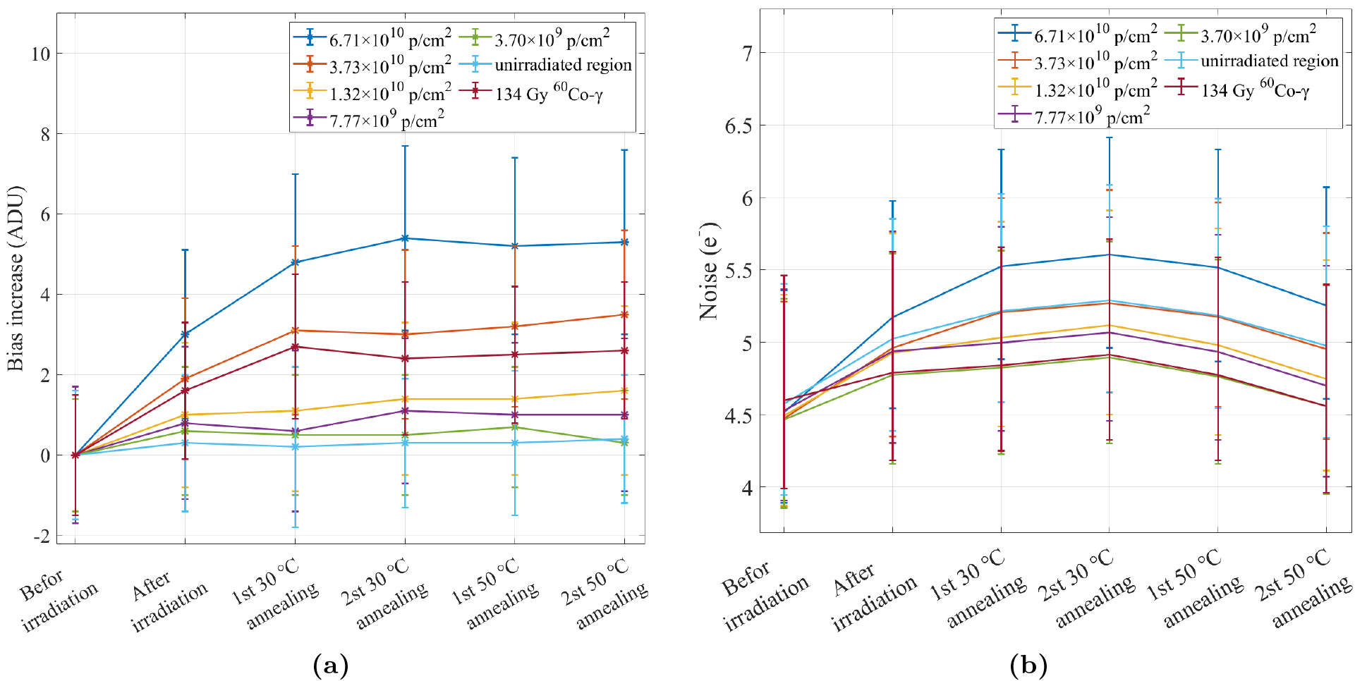Bias and noise variation curves at different stages of irradiation and annealing. (a) Bias values. (b) Readout noise values.