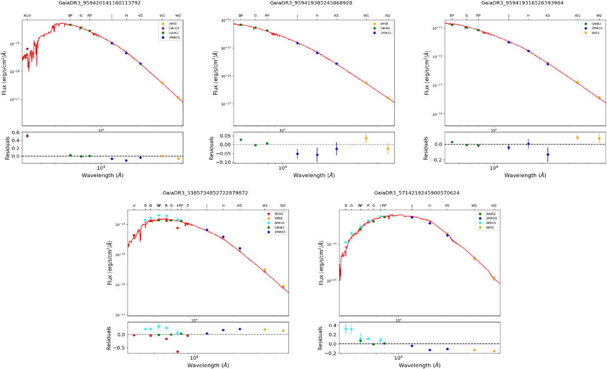 Spectral energy distribution fits for the remaining variable stars identified in the observed OCs, shown here for completeness. The observed multiband photometric fluxes are plotted together with the best-fitting Kurucz model atmospheres, while the lower panels display the corresponding residuals. These SEDs were used to estimate the stellar parameters reported in Table 3.