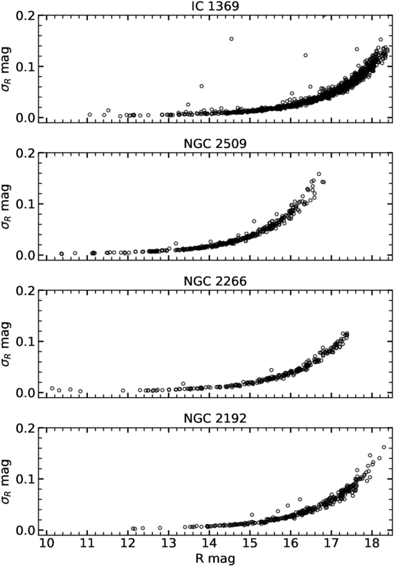Mean photometric uncertainties as a function of stellar brightness in the R band for the clusters under study. Each panel shows the variation of photometric error with R-band magnitude. The plots indicate that the uncertainty remains below ∼0.01 mag for the brighter stars and gradually increases up to ∼0.15–0.20 mag toward the fainter end. The magnitude distribution for NGC 2509 appears truncated at the faint end compared to the other clusters. This effect arises from differences in observing conditions and the shorter total integration time for this cluster, which limits the detection of faint sources.