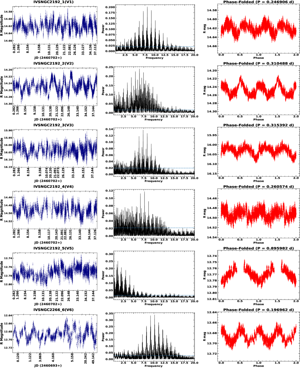 Time-series photometric analysis of the newly identified variable stars V1–V6 in the observed OCs. Left panels: original R-band light curves plotted as magnitude versus time (shown as JD − JD0 for clarity). Middle panels: Lomb–Scargle periodograms computed from the calibrated light curves, with the dominant frequency (day−1) peaks corresponding to the adopted variability periods. Periods and amplitudes derived from these light curves are listed in Table 3. The dashed horizontal line in the periodogram denotes the 1% false alarm probability level computed analytically, indicating a highly significant periodic signal. Right panels: phase-folded R-band light curves using the best-fit periods indicated in each panel. The phase-folded curves are shown over two consecutive cycles to emphasize the periodic nature and stability of the variability. The coherent light-curve morphologies and statistically significant periodogram peaks support the classification of these sources as pulsating and rotational variables. In all panels, magnitudes are plotted such that brighter values appear toward the top.