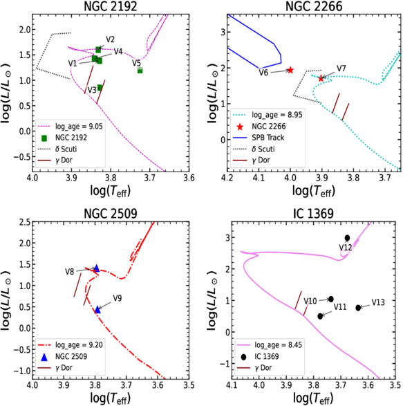 Hertzsprung–Russell diagrams showing the locations of the identified variable stars in the cluster field. The filled symbols correspond to the classified variables, with their positions determined from the derived effective temperatures and luminosities. The plotted evolutionary tracks and isochrones correspond to different ages and evolutionary models, including pre-main-sequence, post-main-sequence, and instability-strip boundaries, as indicated in the legend. The instability regions for δ Scuti, γ Dor, and slowly pulsating B-type (SPB) variables are also shown for reference. The distribution of the variables across these regions helps constrain their evolutionary stages and potential pulsational nature.