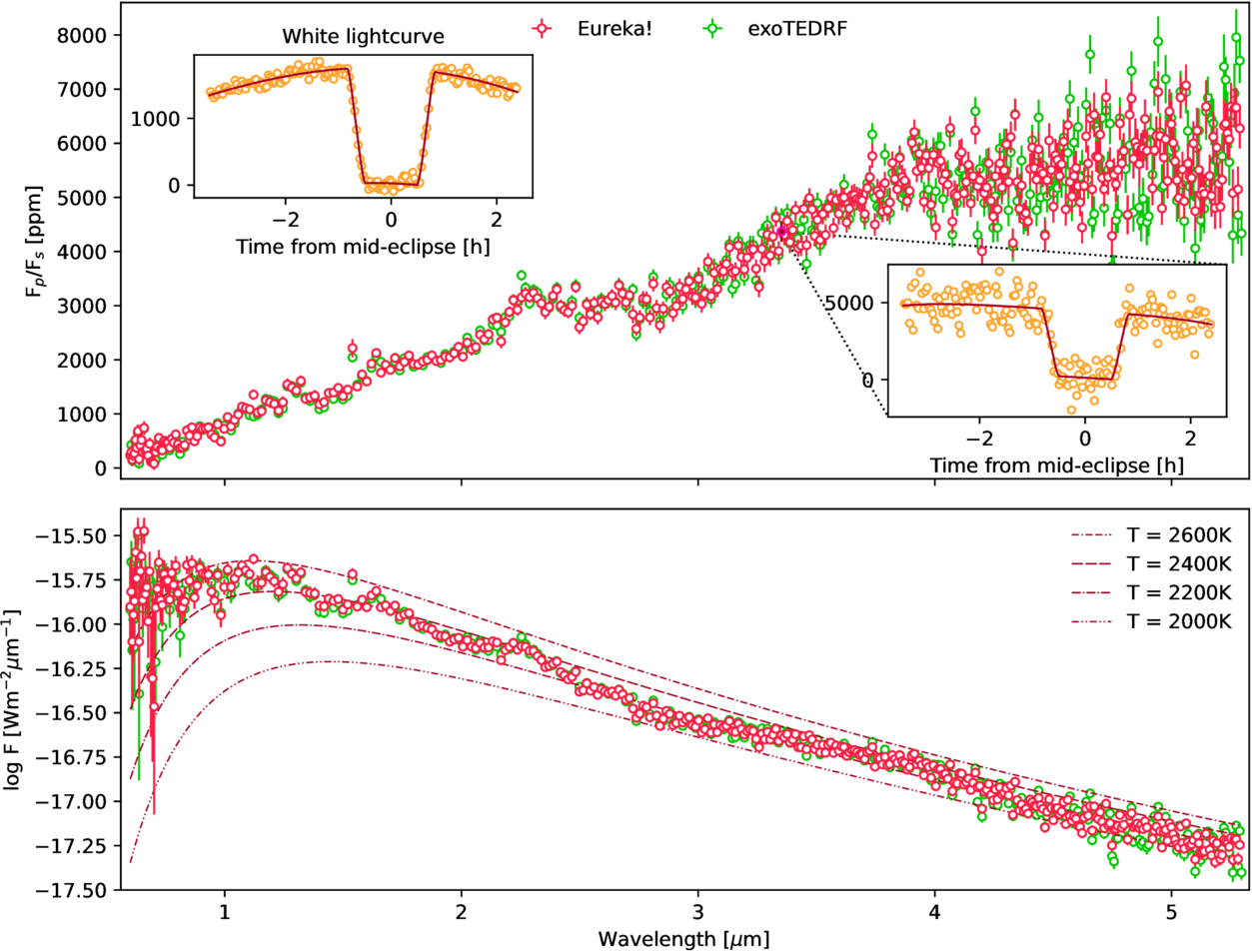 Top: spectroscopic planet-to-star flux ratios with 1σ uncertainties, derived from two independent reductions of the NIRSpec/PRISM data using Eureka! and exoTEDRF, followed by the modeling of the spectroscopic secondary-eclipse lightcurves. The white lightcurve and the 196th spectroscopic lightcurve (Eureka!, both binned to 2 minute cadence for clarity) are shown along with their respective best-fit secondary-eclipse models. Bottom: planetary emission spectra, normalized to the observer’s location, derived from the planet-to-star flux ratios above and modeled PHOENIX stellar spectrum. The mean absolute difference between the two independently reduced spectra is ∼1σ, indicating excellent statistical consistency. For reference, blackbody curves corresponding to 2600, 2400, 2200, and 2000 K are also shown. The significant deviation of the planet’s spectra from blackbody expectations at shorter wavelengths is due to the dominating contribution of the reflected starlight by the planet.