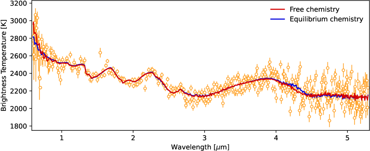 The observed emission spectrum of WASP-19b (Eureka!, orange), shown alongside the best-fit free and equilibrium chemistry models, demonstrating strong consistency.