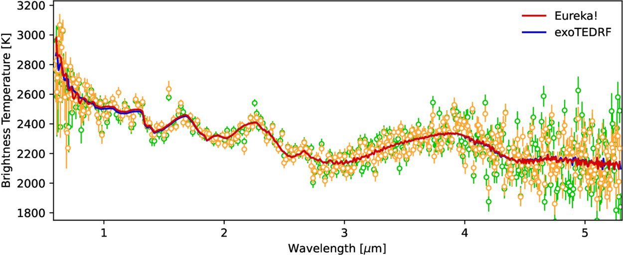 The observed emission spectra of WASP-19b from both Eureka! (orange) and exoTEDRF (green) are shown alongside their corresponding best-fit free-chemistry models. Both models show strong consistency, validating the robustness of retrieved properties.