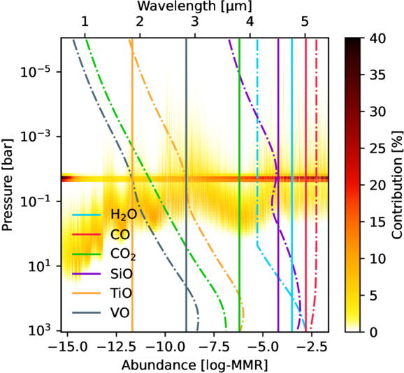 The retrieved median abundances of H2O, CO, CO2, SiO, TiO, and VO are shown from both free (solid) and equilibrium (dashed–dotted) retrievals for comparison (Eureka!), along with the median contribution function from the free-chemistry retrievals. The strong contribution from SiO2(s) cloud is apparent.