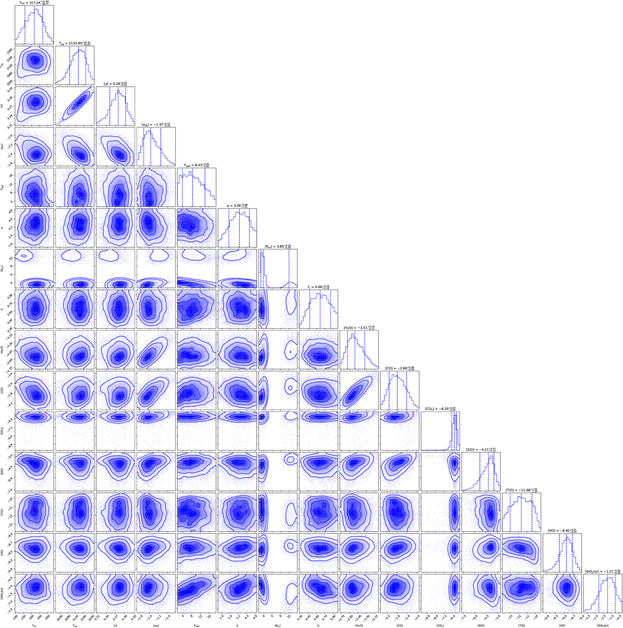 Corner plot showing the posterior distributions from the free-chemistry retrieval analysis (Eureka!), including only the well-constrained molecular species.