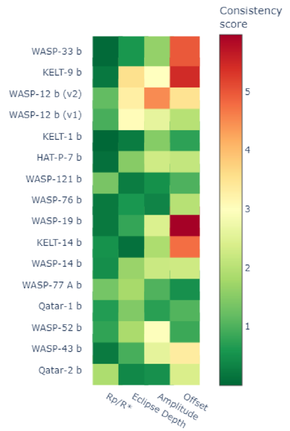 A comparison of the consistency score for Rp/R⋆, Deptheclipse, A, and ϕ using the Equation (7) highlights that Rp/R⋆ and Deptheclipse are mostly consistent, whereas the phase-curve offset shows the least consistency. The corresponding results are reported in Table 4.