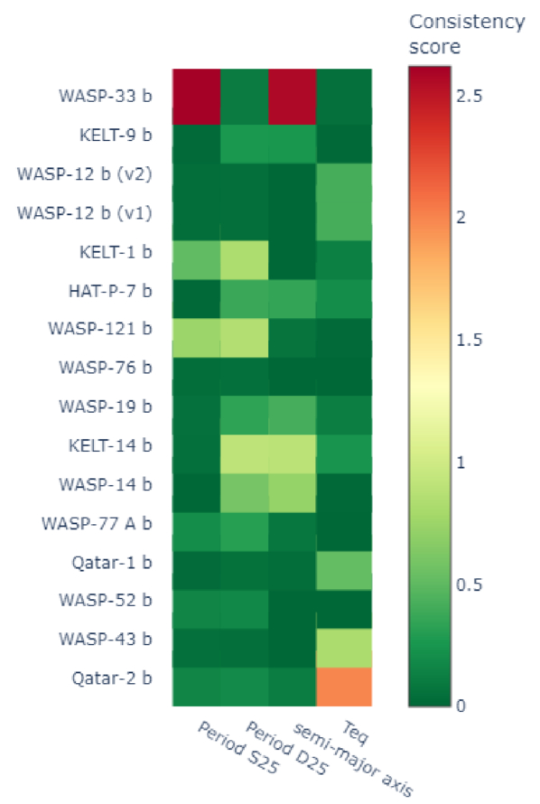 A comparison of the consistency scores for three system parameters is presented. Equation (6) was used to compare the periods from S25 with the periods calculated using the Equation (3) (Period S25, in days) and the periods from D25 with those calculated using the Equation (3) (Period D25, in days). Equation (7) was used to compare the semimajor axes from D25 and S25 (semimajor axis, in AU) and the equilibrium temperatures from D25 and S25 (Teq, in K). The corresponding results are reported in Table 5.