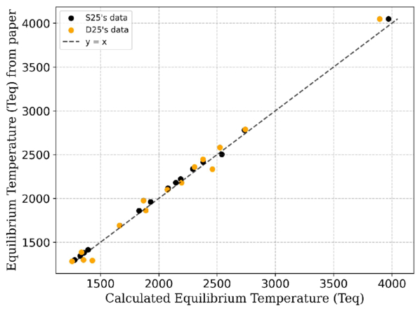A comparison is made between the equilibrium temperature calculated, using the Equation (8) for both S25 and D25, and the equilibrium temperature given in the papers. In orange the data are from D25 and in black they are from S25.