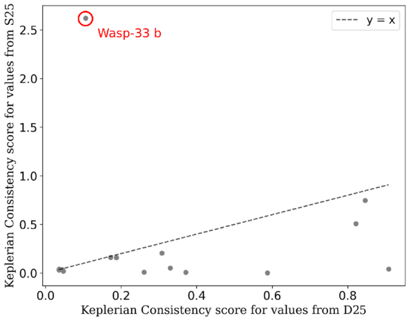 Keplerian consistency score (Equation (6)) between the data from S25 and D25 with all the planets. We have overlaid unity as a dashed line. This graph shows that parameters taken from the same publication may be incompatible with Kepler’s law (Equation (3)) revealing inconsistencies in the data used (and in the NEA). Therefore, it does not appear that the erroneous data is the cause of WASP-33b being an outlier. Rather, the system itself appears to be physically inconsistent. This may be due to stellar variability (this variability could be interfering with the light curve fit).