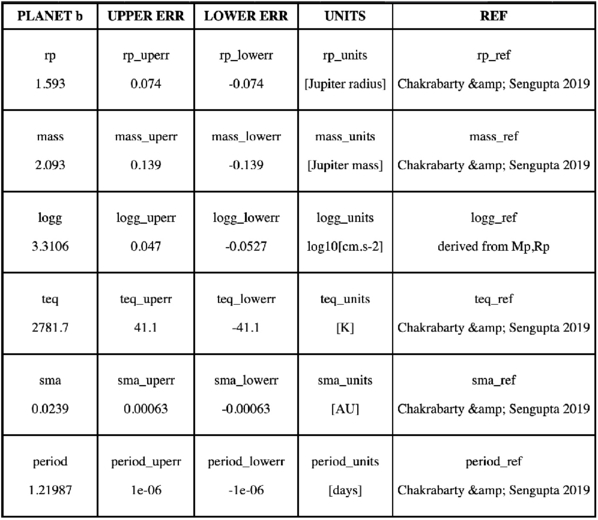WASP-33 b parameters from EXCALIBUR pipeline (excalibur.ipac.caltech.edu/app/db/item?path=698.WASP-33.system.finalize.parameters) for the Run ID 698.