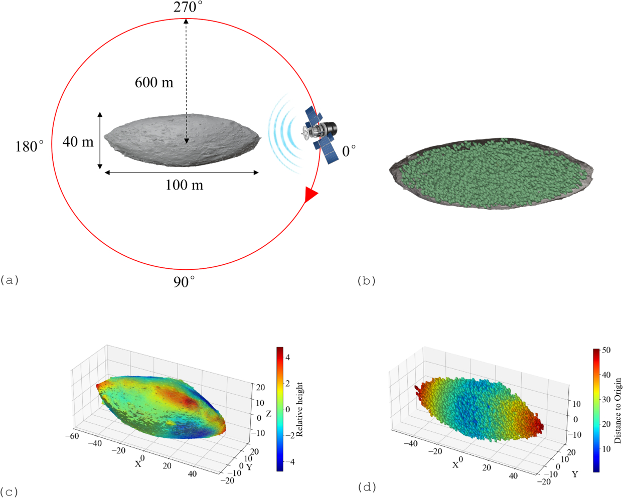 Schematic diagram of the orbital simulation model. (a) Simulation model of asteroid 2016 HO3 and the radar orbital path; (b) internal sectional view of asteroid 2016 HO3; (c) surface DEM data; (d) internal rubble DEM data.