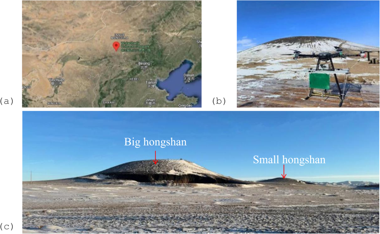 Background information for ground testing. (a) Location of the ground-test area (red marker); (b) UAV equipped with ACSR; (c) panoramic view of the ground-test area.