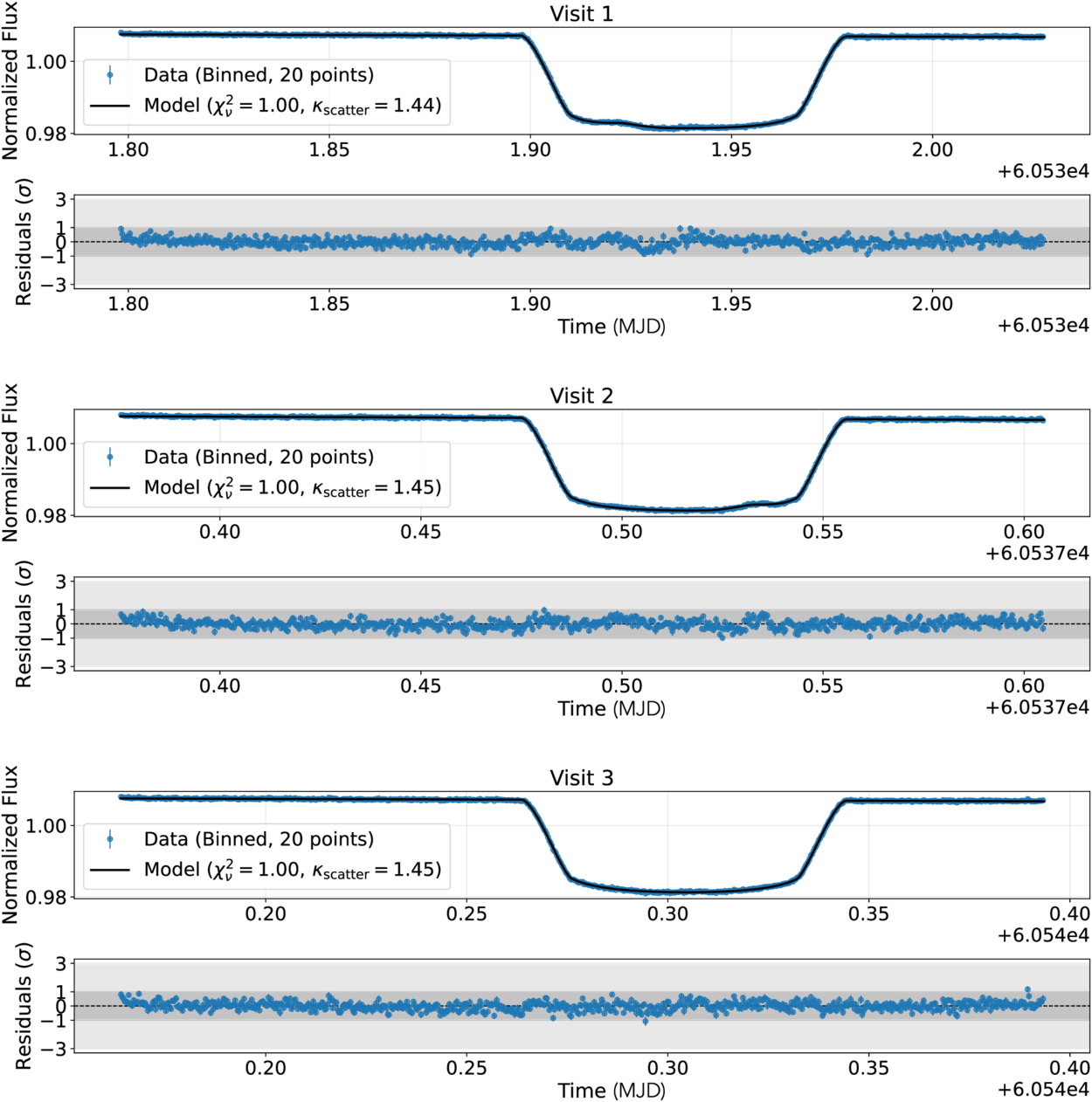 White light curves and best-fit transit models for Visits 1 (top), 2 (middle), and 3 (bottom) of the optimized Eureka!+fleck dataset. Residuals for the model-fits are provided below the light curve of the same transit to show time-correlated noise. The bump near the ingress of Visit 1, to the left of the transit center (∼1.92 + 6.053e4 MJD), represents the starspot illustrated in the top plot of Figure 2. Similarly, the raised feature near the egress of Visit 2, to the right of the transit center (∼0.54 + 6.0537e4 MJD), represents the starspot illustrated in the bottom subfigure of Figure 2. ﹩{\chi }_{\nu }^{2}﹩ and scatter multiplier values, κscatter (T. Bell et al. 2022; B. M. Morris 2022), are provided as metrics for the model-fit and necessary error inflation (to planet radius estimates) during light-curve fitting.