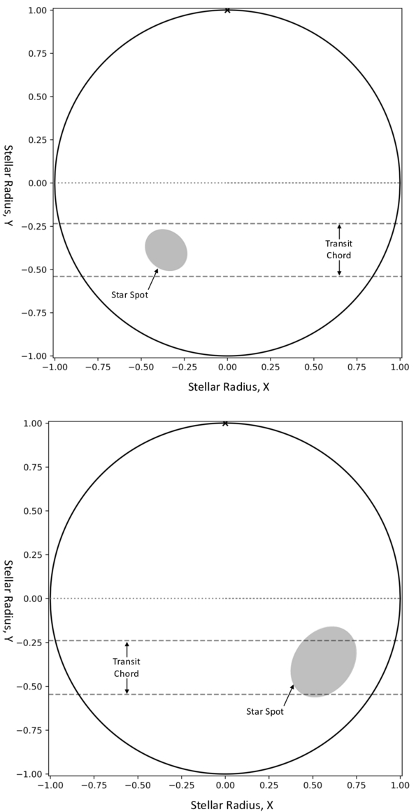 Modeled fleck star spots for Visits 1 (top) and 2 (bottom). Visit 3 is not shown because the preferred transit model is spot-free for the Eureka!+fleck reduction. Interestingly, the spots share roughly the same latitude across the transit chord, with similar spot contrasts of 0.960 ± 0.008 and 0.971 ± 0.002 for Visits 1 and 2, respectively. Characteristics for the spots modeled for both reductions are detailed in Table A1.