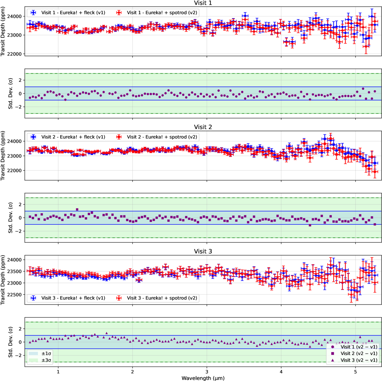 A comparison of the independently generated optimized Eureka!+fleck and manual Eureka!+spotrod transmission spectra for all three visits. Nearly all values fall within ±1σ relative to the other reduction, providing strong validation of the spectra generated for all visits across both approaches.